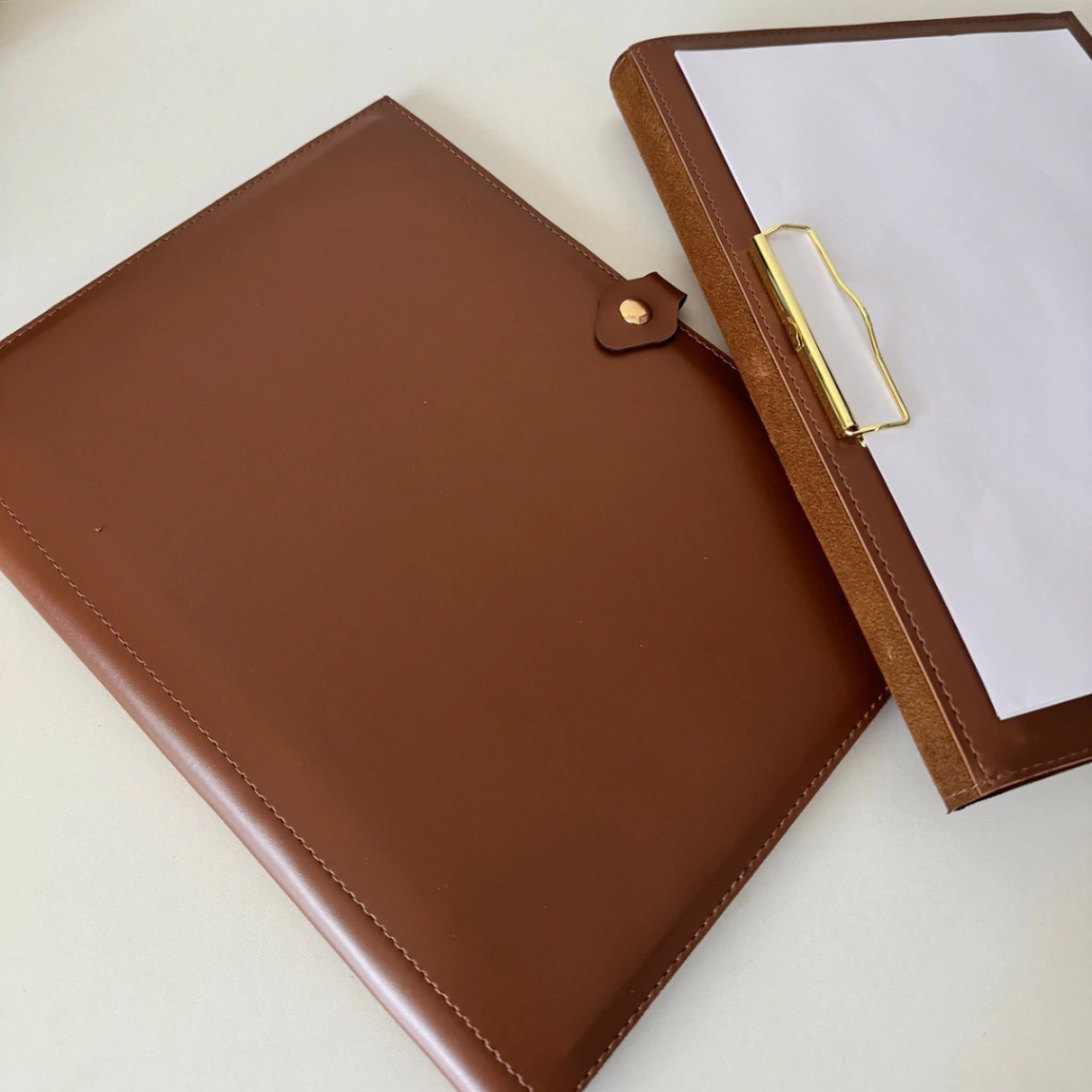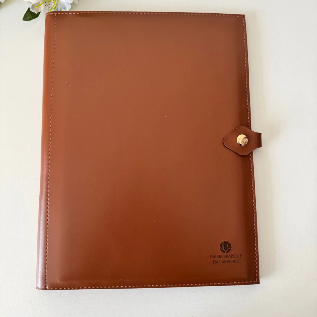 Em material sintético semelhante ao couro, base PVC que não escama, com espessura de 1,4mm, e com uma estruturada em MDF. Fechamento em botão colchete suave. Bolso interno em sintético.